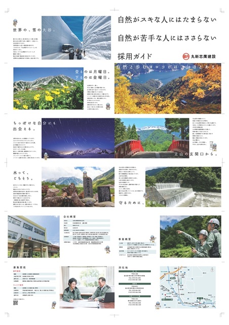 会社パンフレットの特徴としては、富山の美しい景色や社員の仕事の様子を紹介し、「この会社で働いたら、どんな毎日が待っているんだろう?」と、誰が見てもわかりやすくイメージしてもらえるように、写真と文章で丁寧につくりあげました。