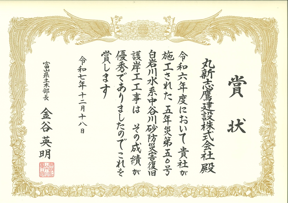 このたび当社が施工した工事が、富山県土木部長賞を受賞しました。